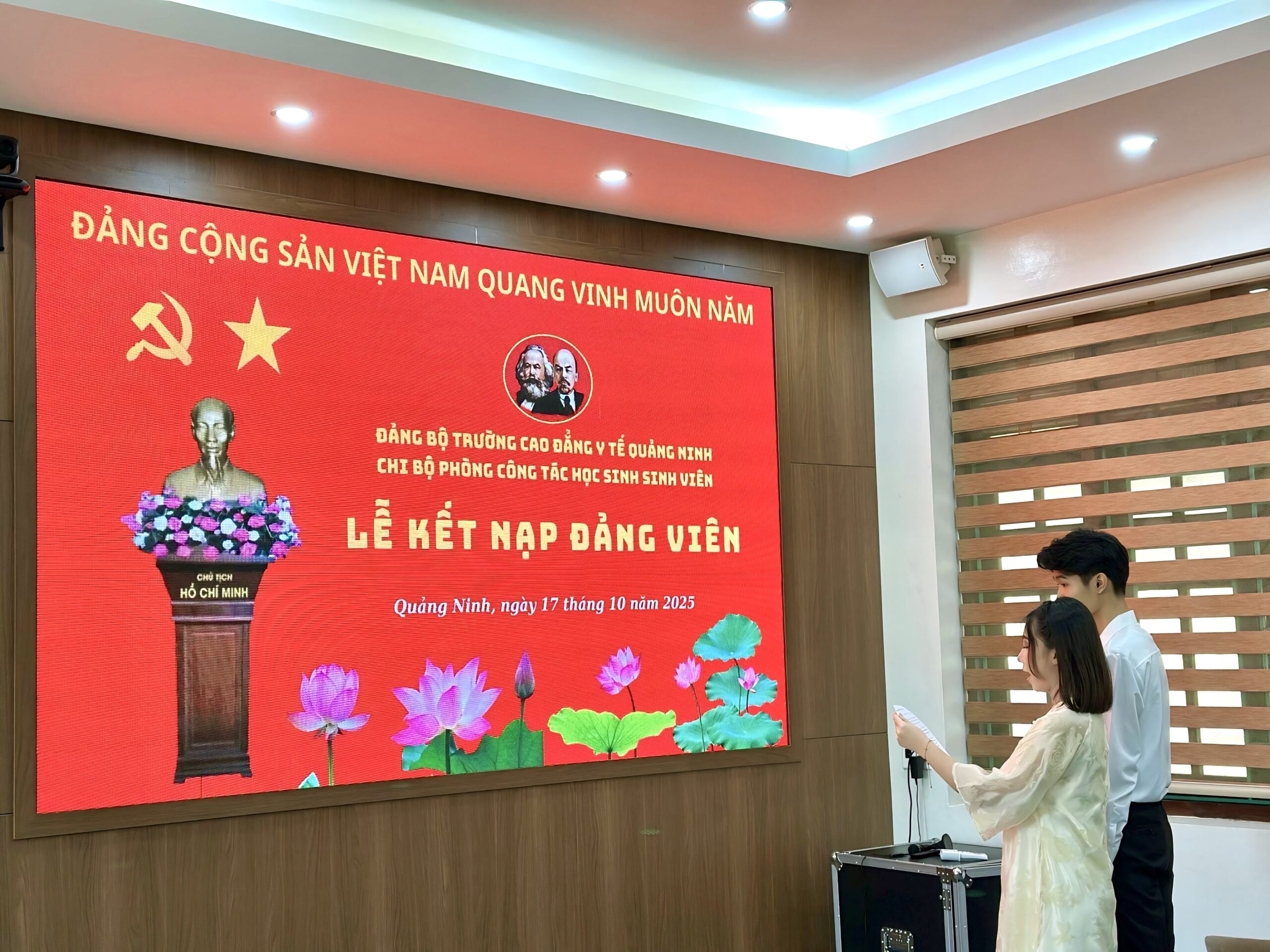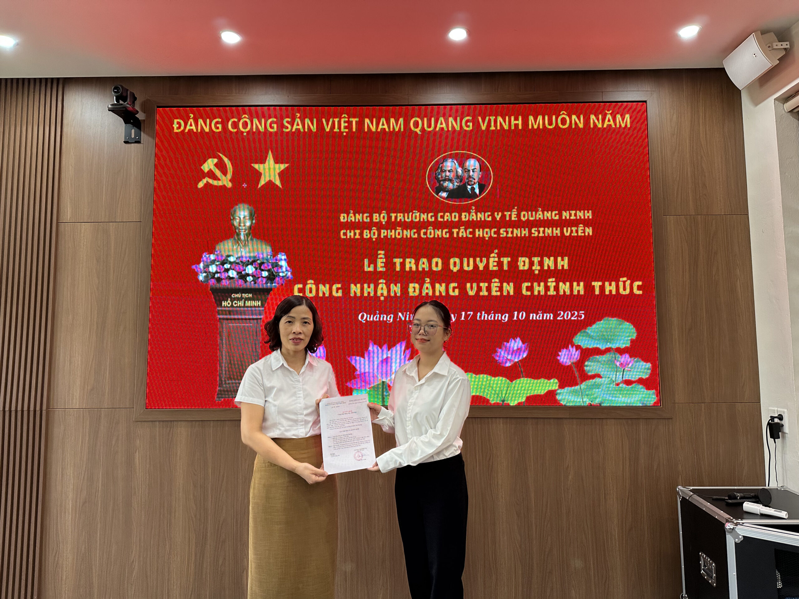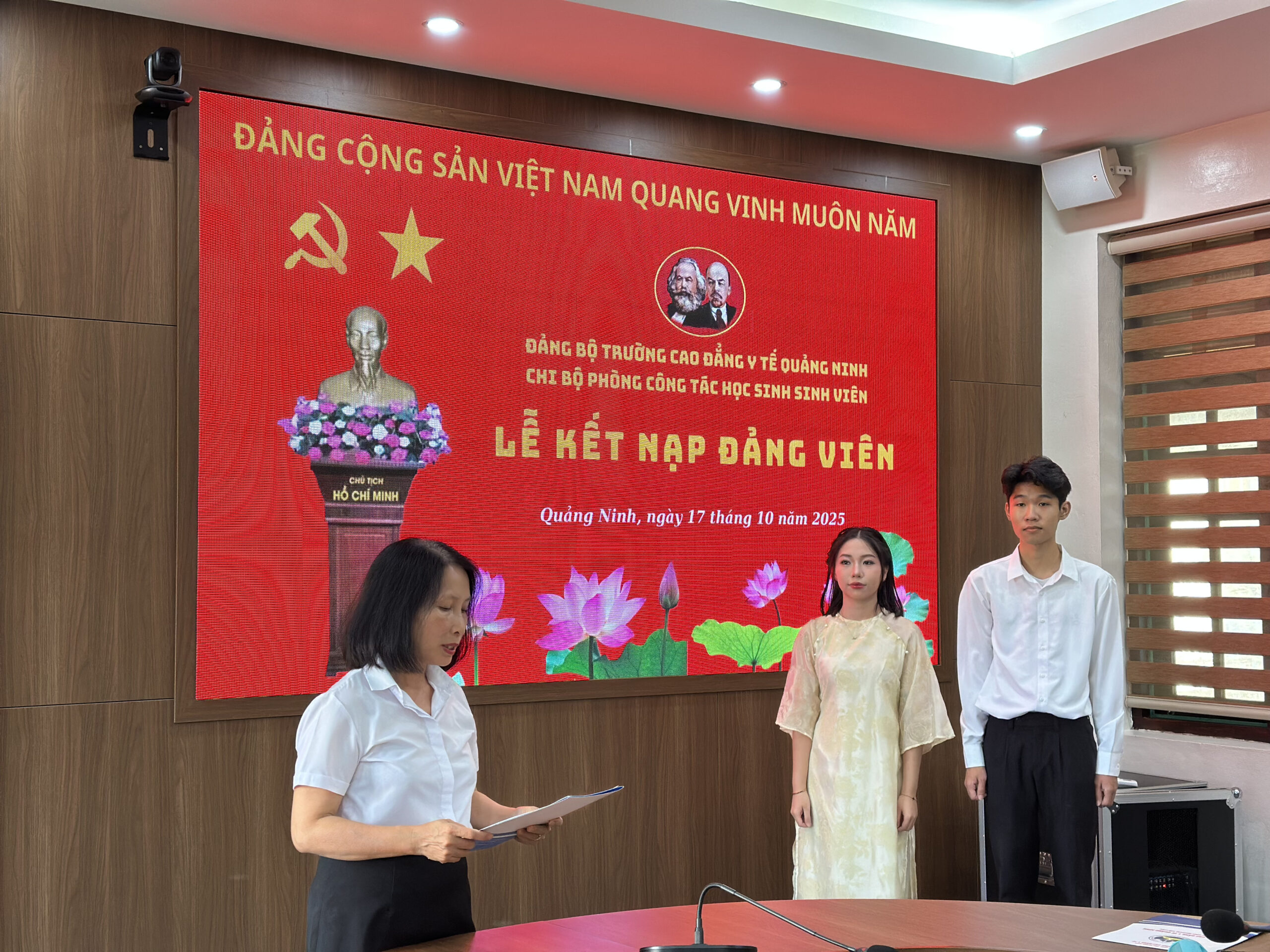 Thực hiện sự chỉ đạo của Đảng ủy UBND Tỉnh và được sự nhất trí của Đảng ủy Trường Cao đẳng Y tế Quảng Ninh, sáng ngày 17/10/2024, Chi bộ Phòng Công tác Học sinh, sinh viên (CTHSSV) Trường Cao đẳng Y tế Quảng Ninh đã long trọng tổ chức Lễ kết nạp Đảng viên cho hai quần chúng ưu tú Trần Ngọc Mai Hoa – Sinh viên lớp CĐ Điều dưỡng K17A và Bùi Quang Huy – Sinh viên lớp CĐ Điều dưỡng K17B, đồng thời công bố Quyết định công nhận Đảng viên chính thức cho đồng chí Đoàn Thị Thương – Sinh viên lớp CĐ Điều dưỡng K17A