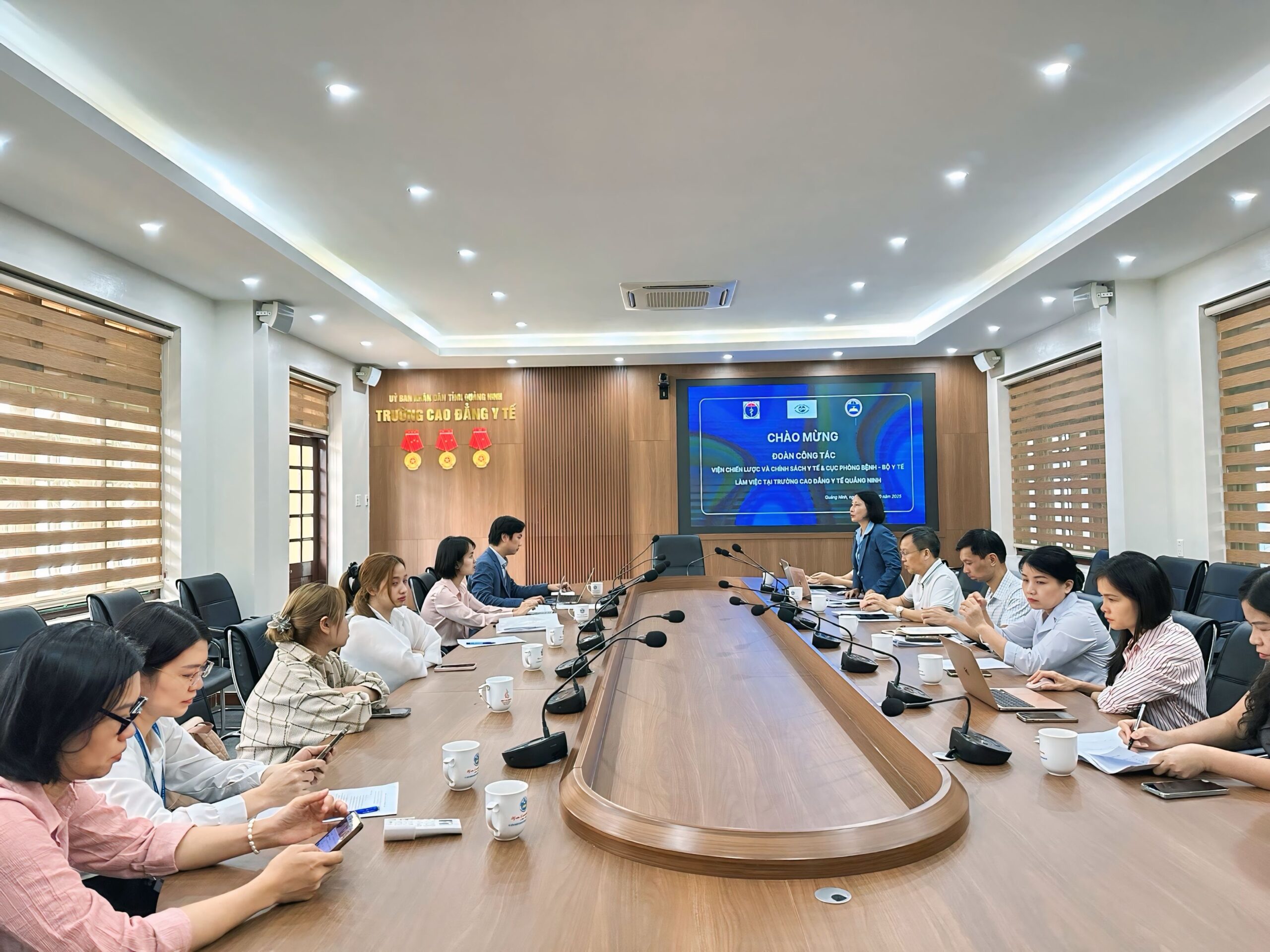 Đoàn công tác đã nghe báo cáo và trao đổi nội dung chi tiết về thực trạng công tác y tế học đường tại Trường Cao đẳng Y tế Quảng Ninh